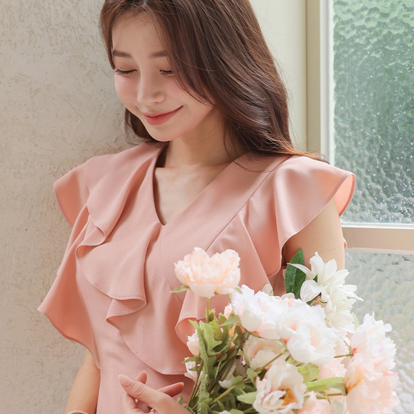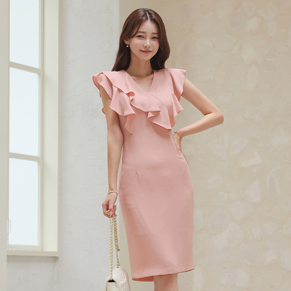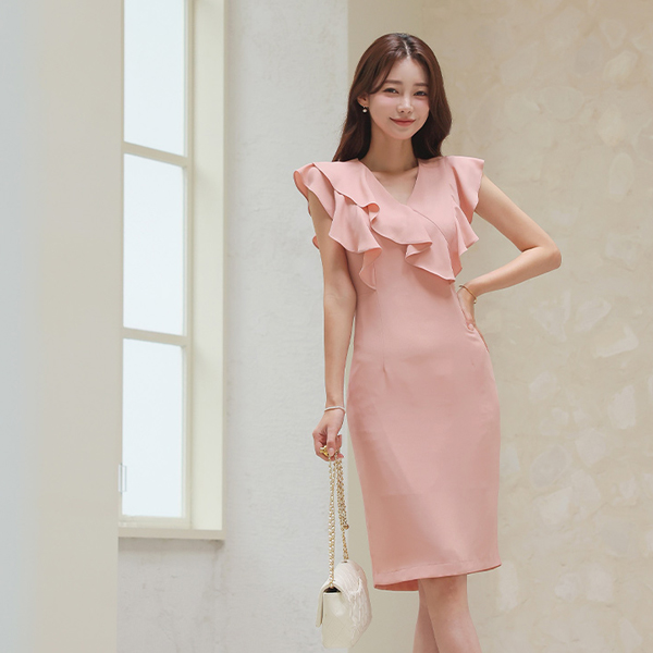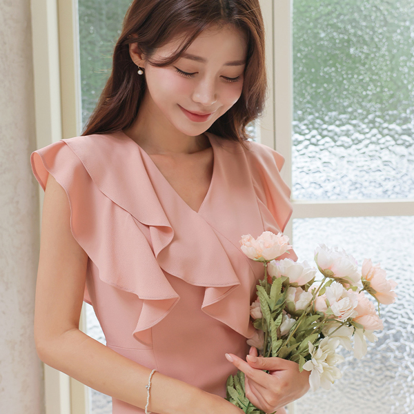 ロマンチック ブイネック フリル スリーブレス Hライン ワンピース