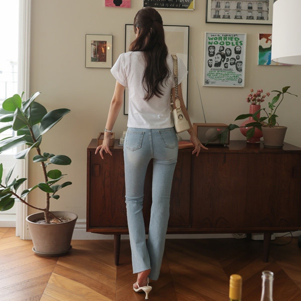 Light-Blue Stretchy-Waist スリム ブーツカット ロング デニム パンツ