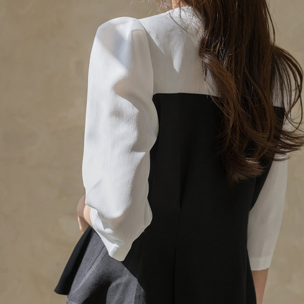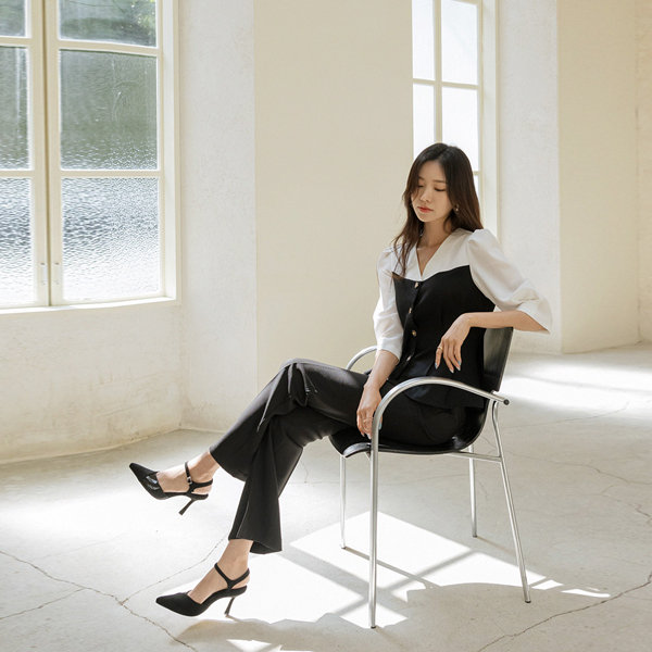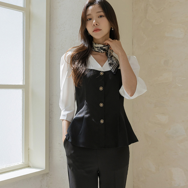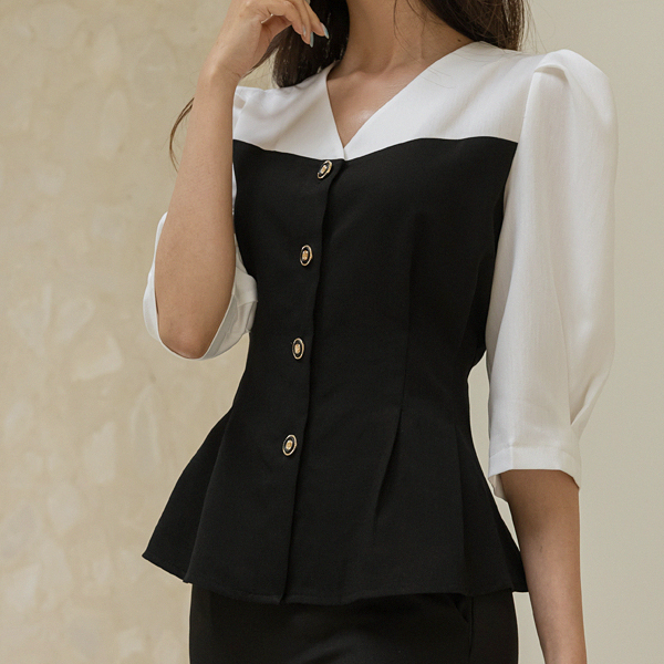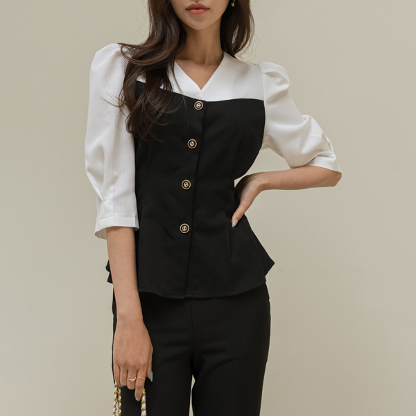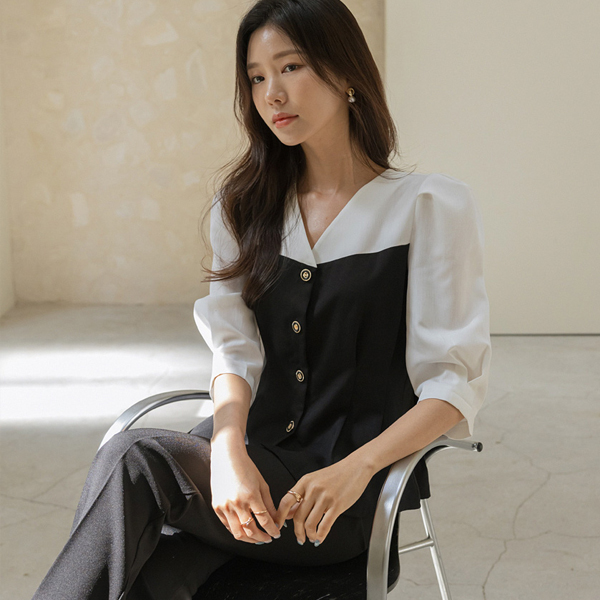エレガンス ゴールド ボタン 配色 スリムフィット ブラウス
