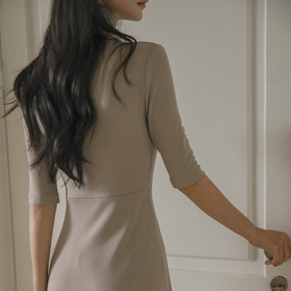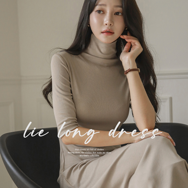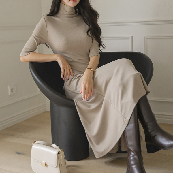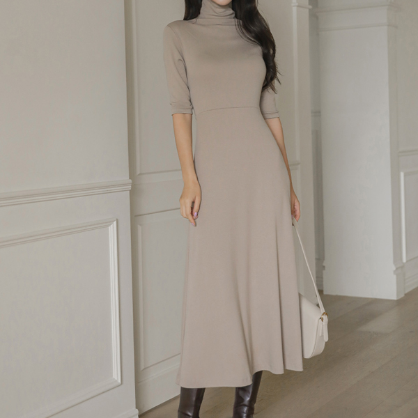 ハイネック Aライン 弾力 ロング ワンピース