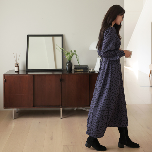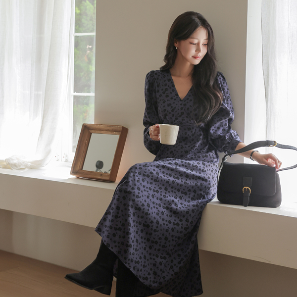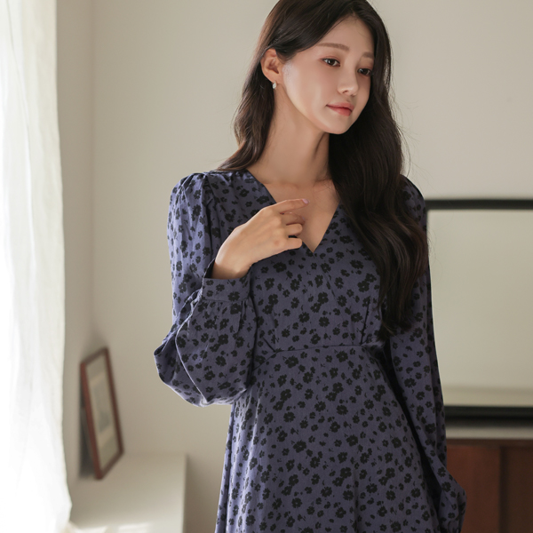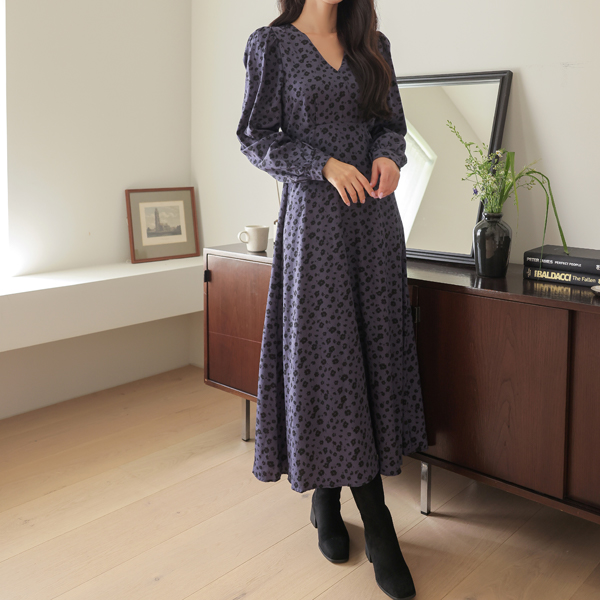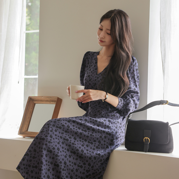 配色 花柄 パタン ブイネック ロング ワンピース