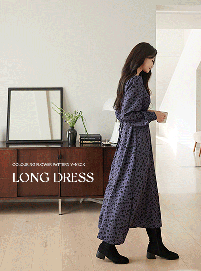 配色 花柄 パタン ブイネック ロング ワンピース