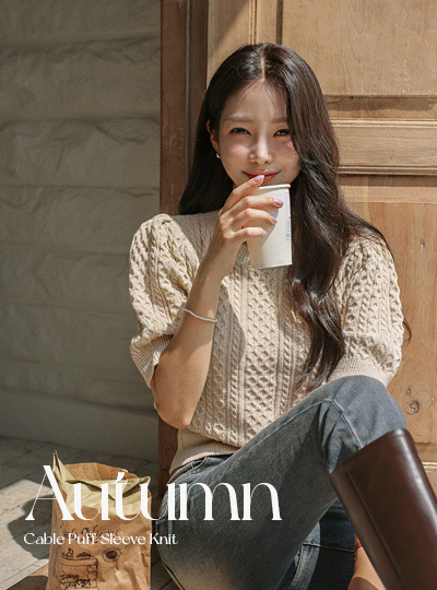 秋 ケーブル パフ 袖 ニット