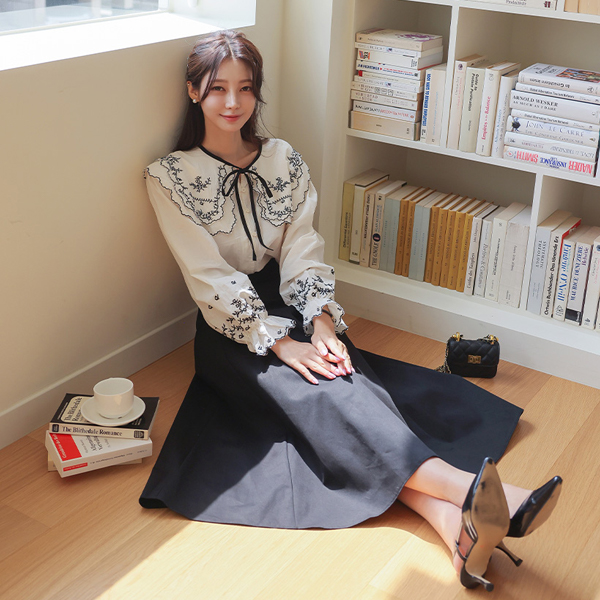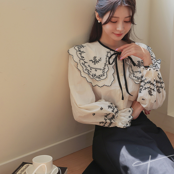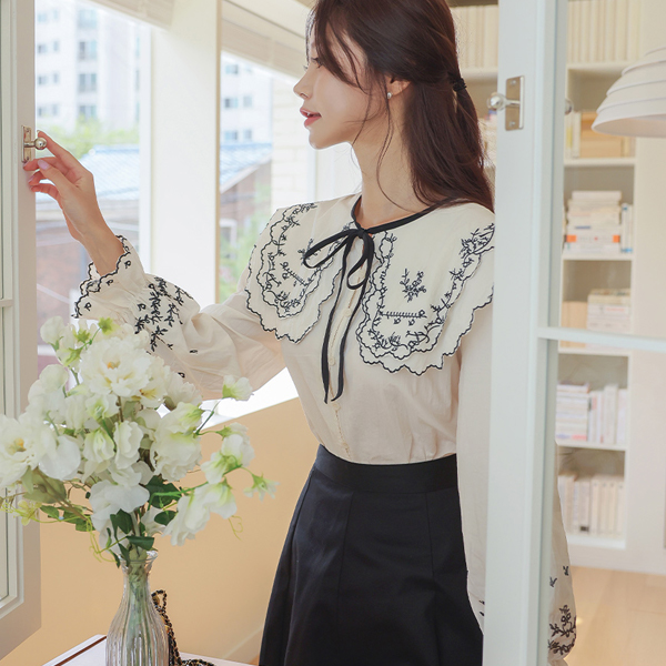 ロマンチック 刺繍 ビッグ ダブル カラー リボン ブラウス