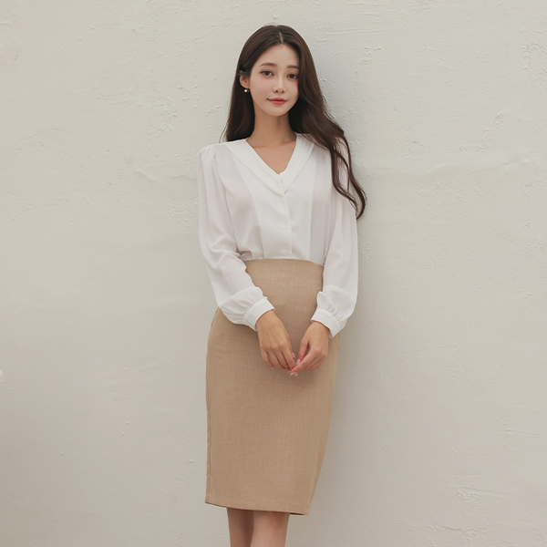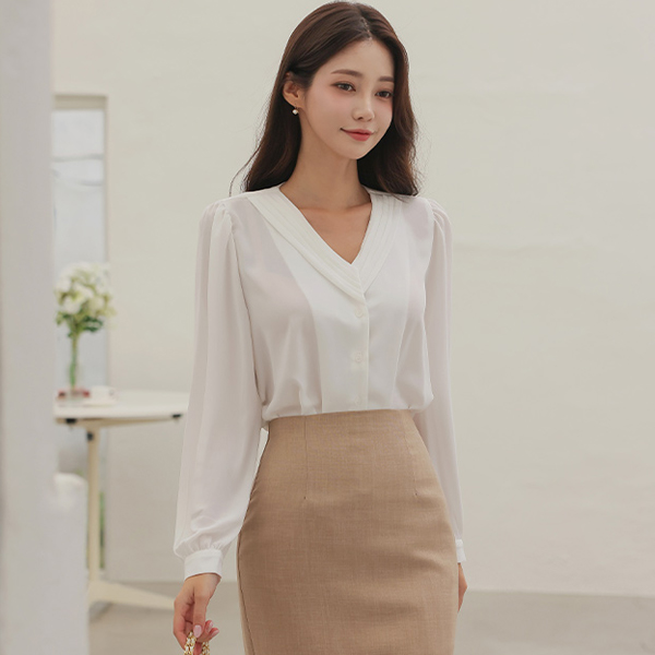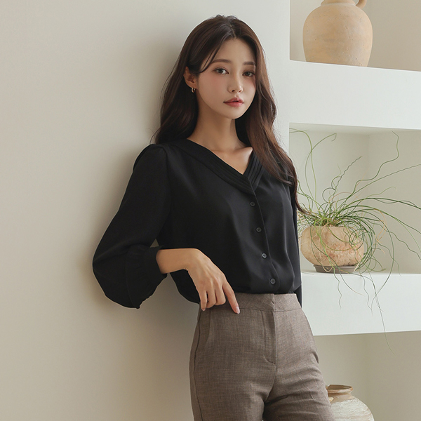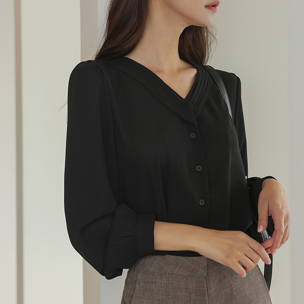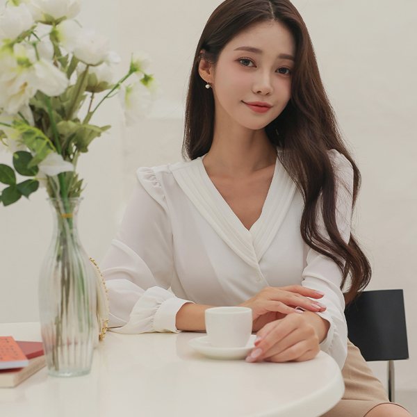 オープン V 주름넥 ブラウス
