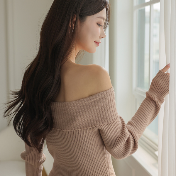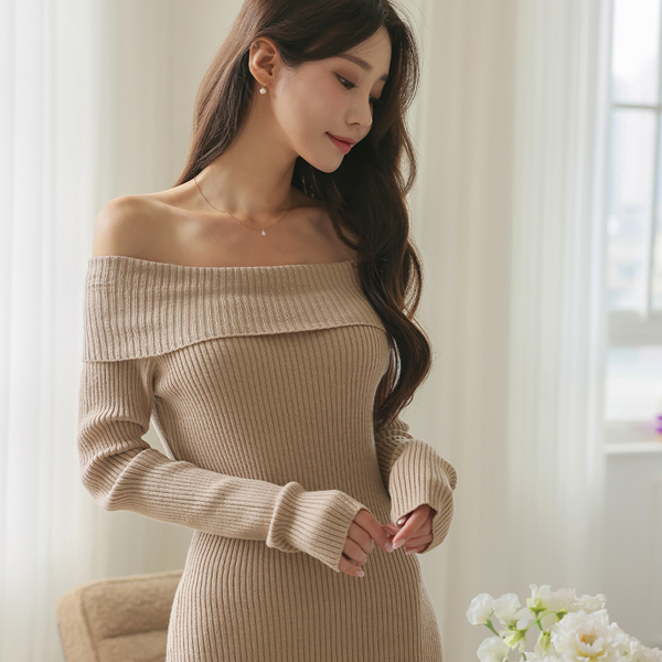 ほっそりした Open ショルダー コール天 マーメイド ニット ロング ワンピース