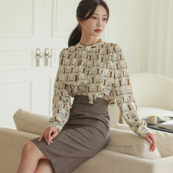 オープン V 주름넥 ブラウス