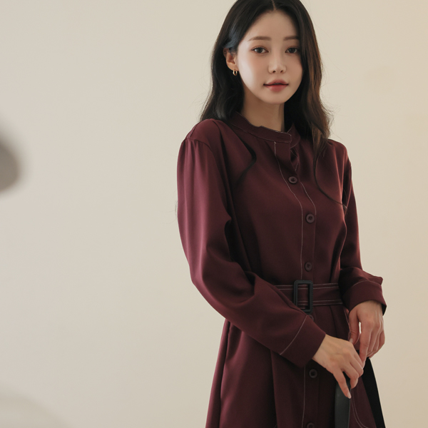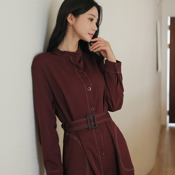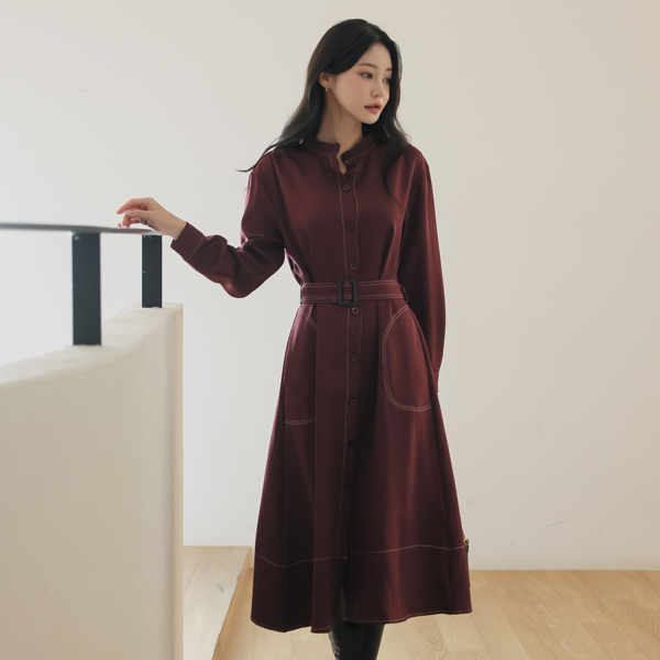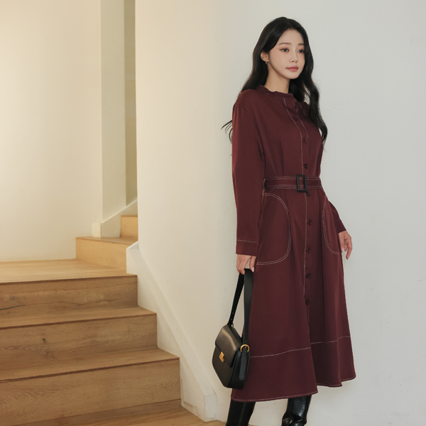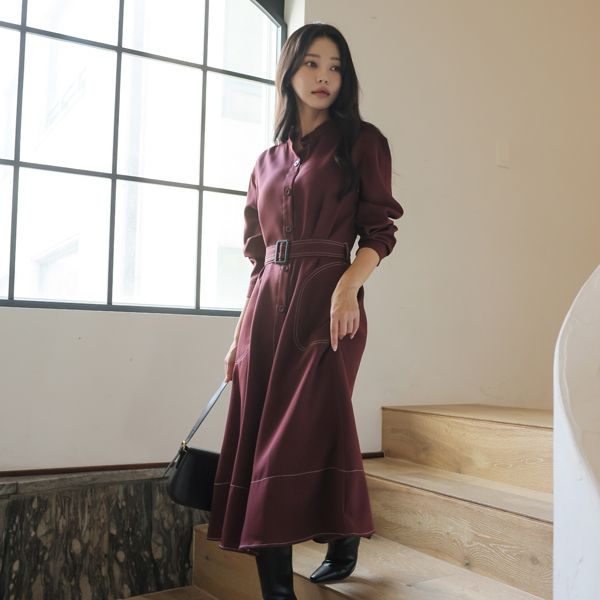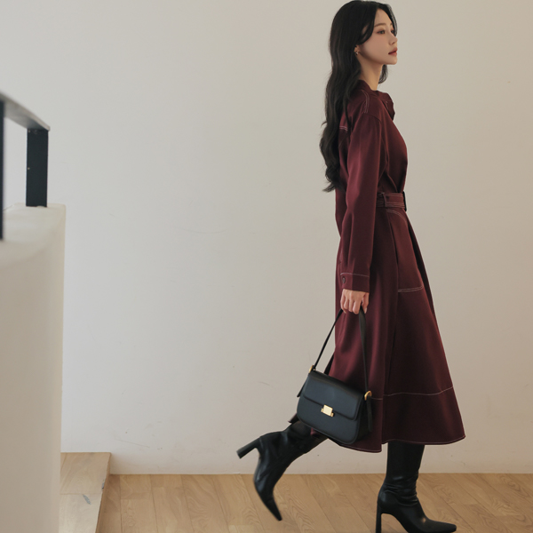 配色 ステッチ ポイント ベルティード ロング ワンピース