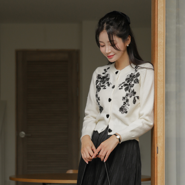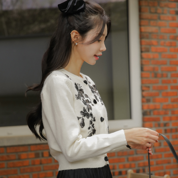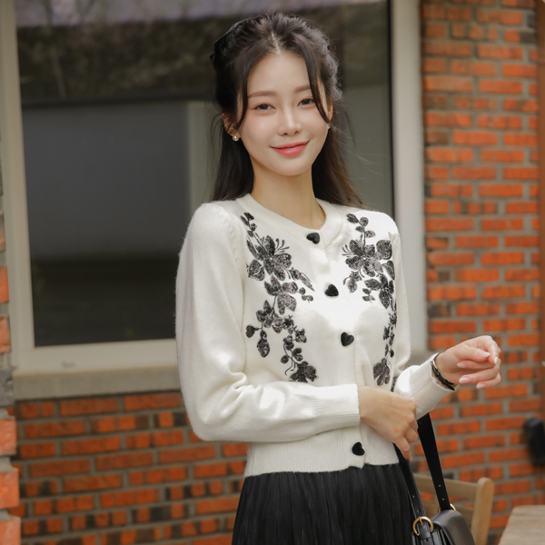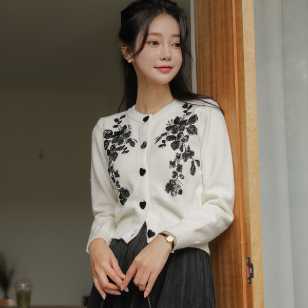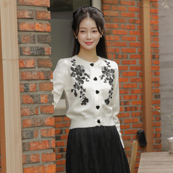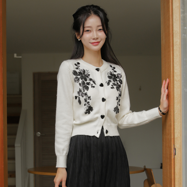 ビーズ 花柄 ハート ボタン カーディガン