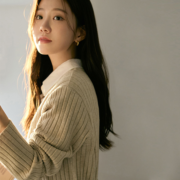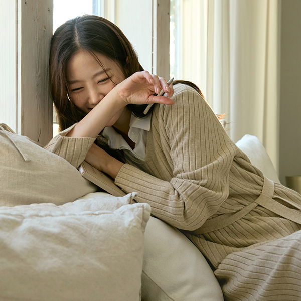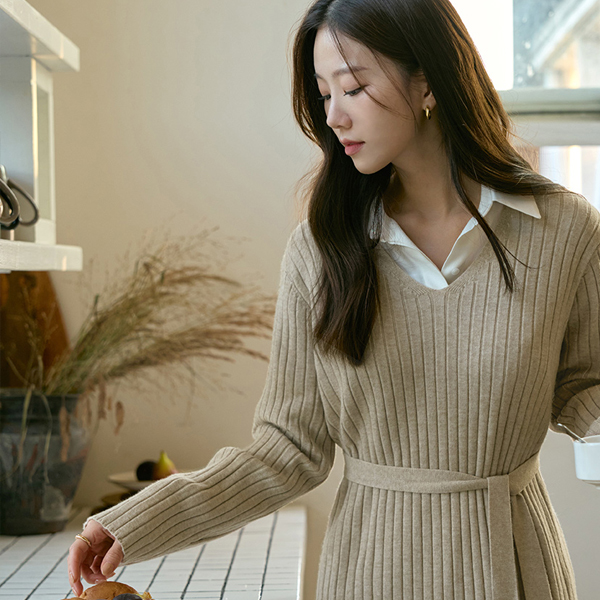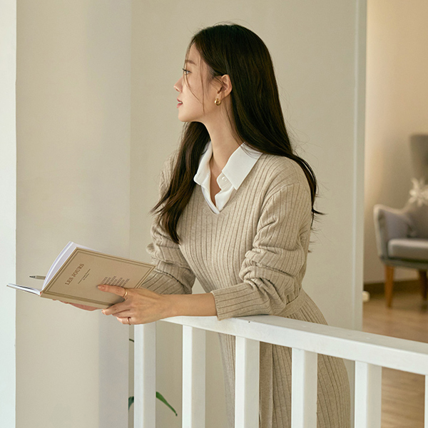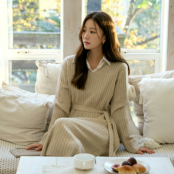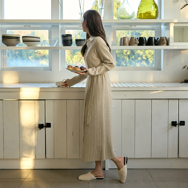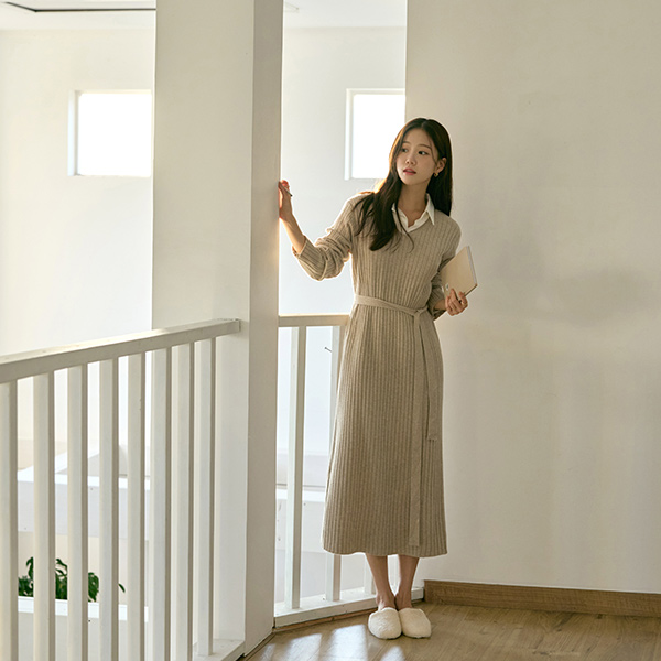 楽に着られる ブイネック コール天 ロング ニット ワンピース