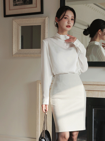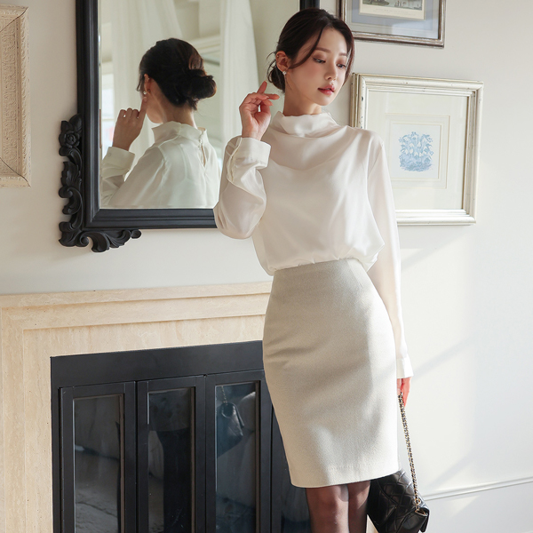 サテン ハーフネック ドレープ ブラウス