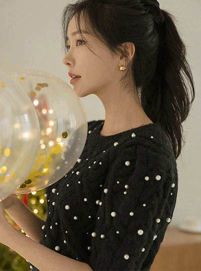 スノー 真珠 飾り パフ袖 ウール ニット