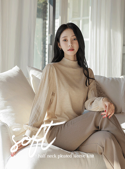 やわらかい ハーフネック プリーツ 袖 ニット