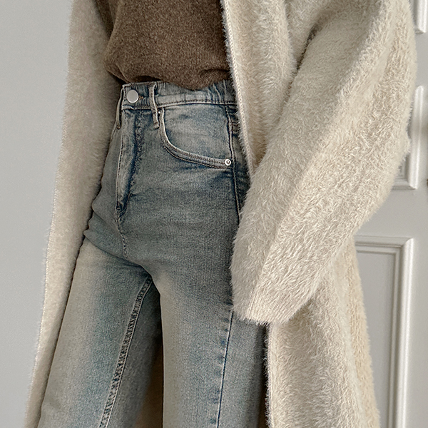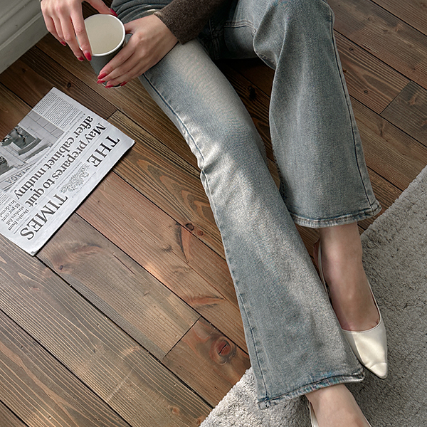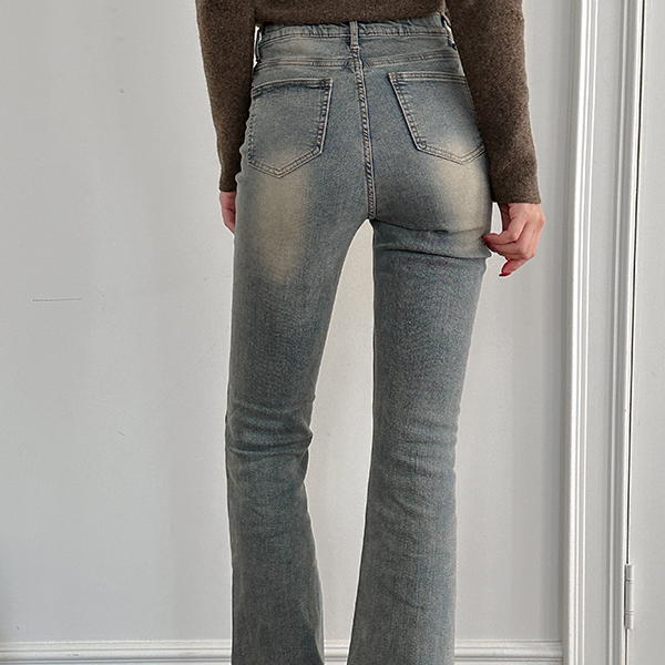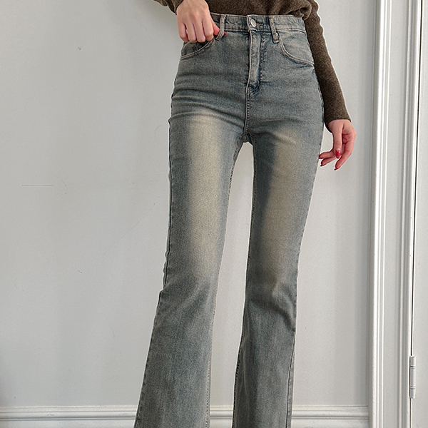 ビンテージ カラー Stretchy-Waist スリム ブーツカット デニム パンツ (起毛裏地)