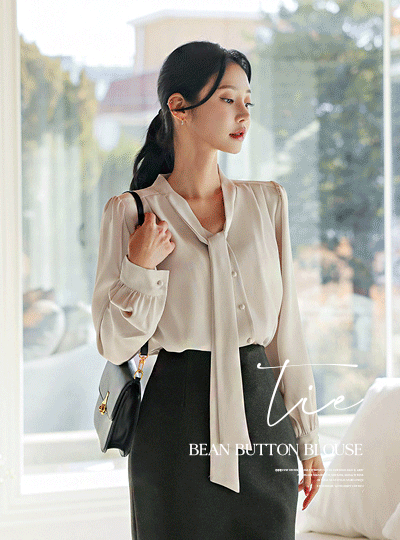 ブイネック タイ 豆ボタン ブラウス