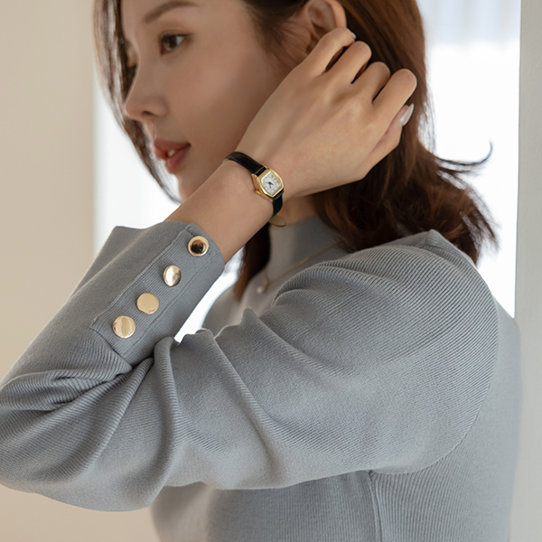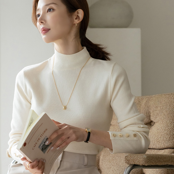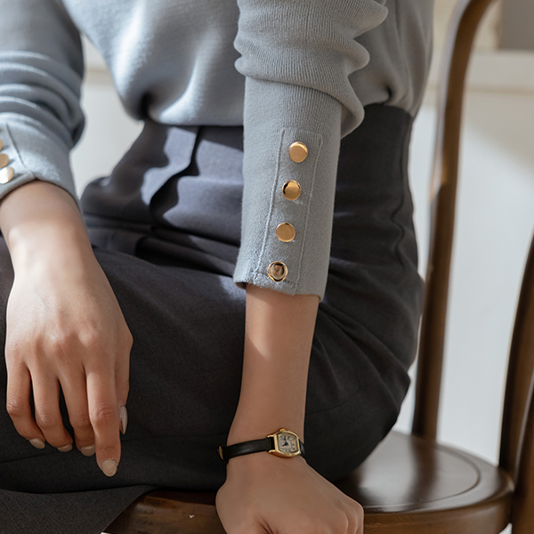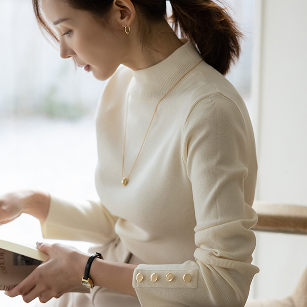 ハーフネック 袖 ゴールド ボタン ポイント ニット