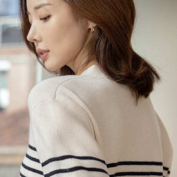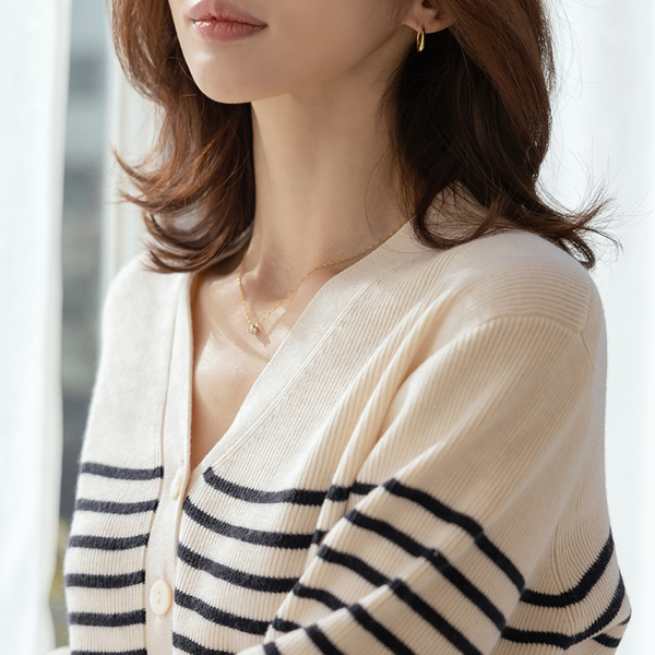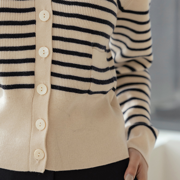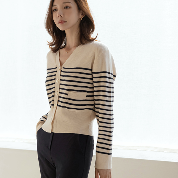 ブイネック ストライプ ポケット ウール カーディガン