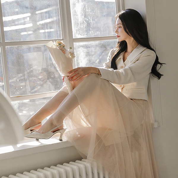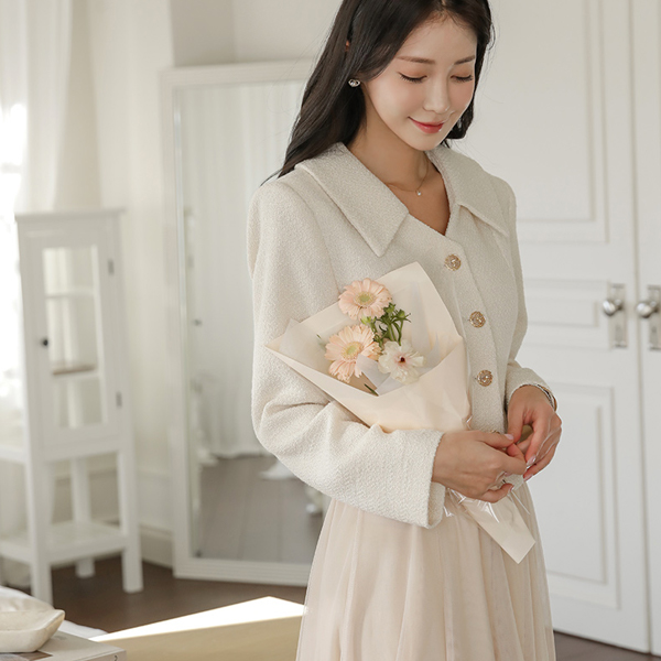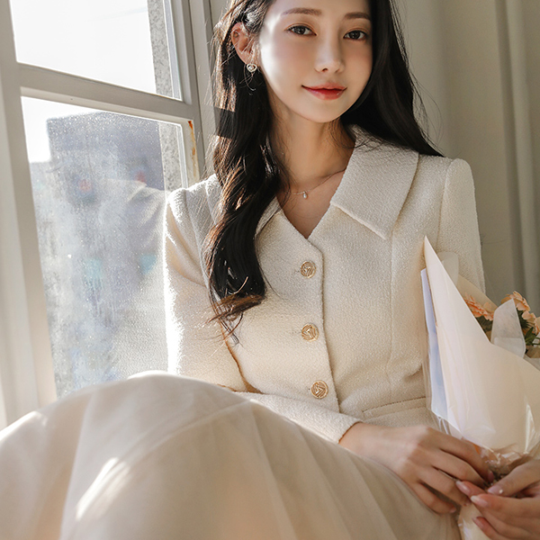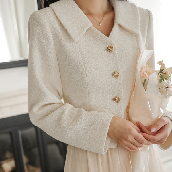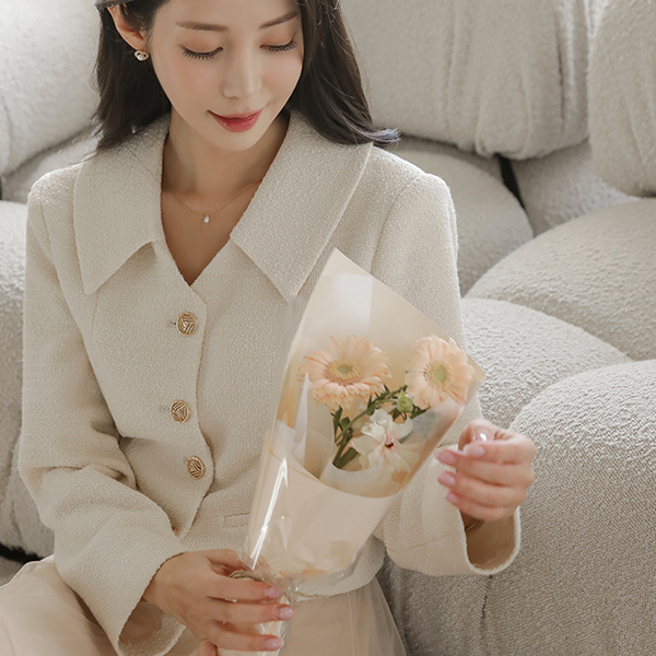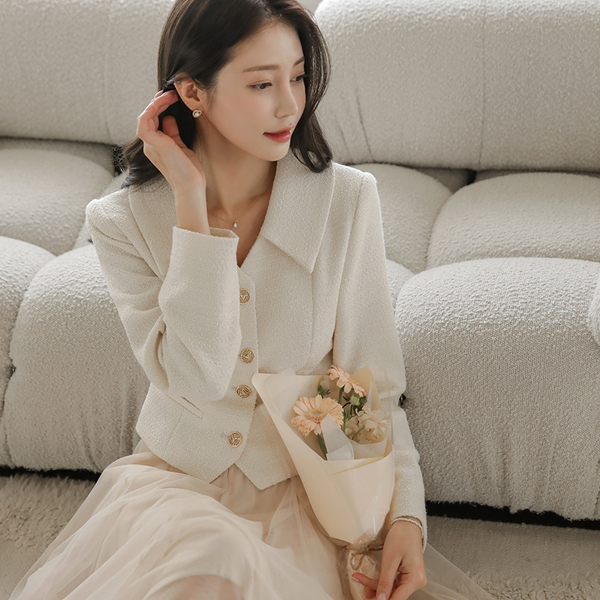 ロマンチック ブイネック カラー ウール ツイード ジャケット