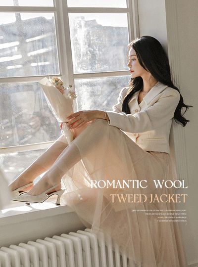 ロマンチック ブイネック カラー ウール ツイード ジャケット