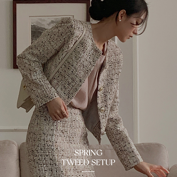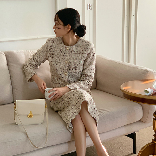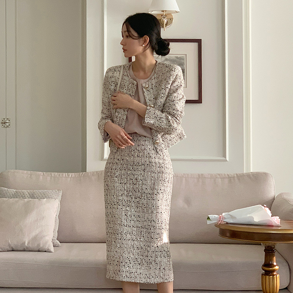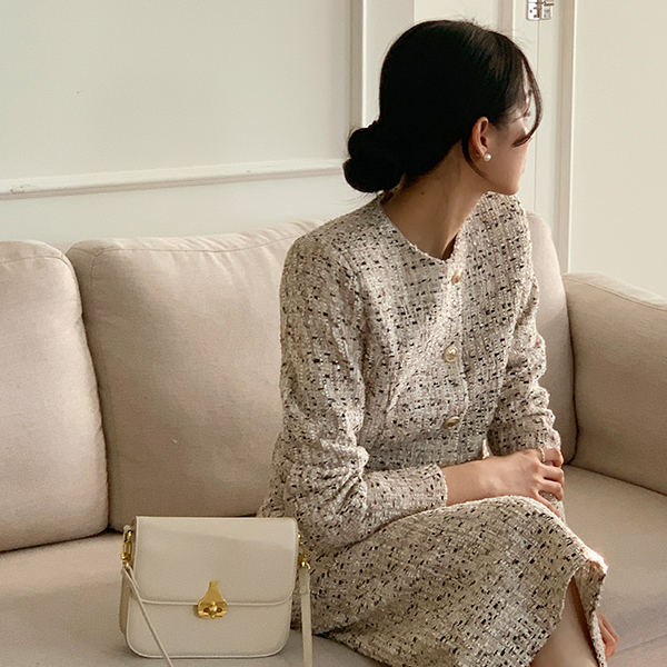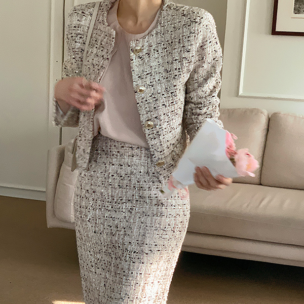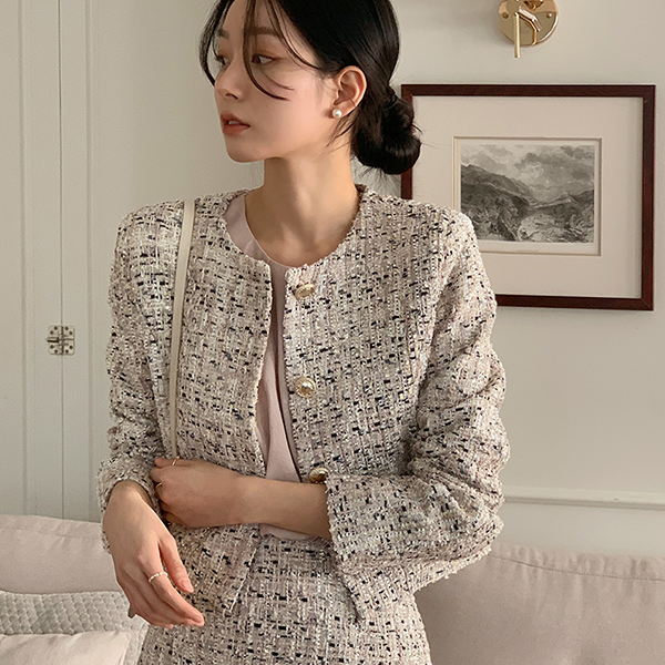きらめく ミックス カラー ラウンドネック ツイード ジャケット