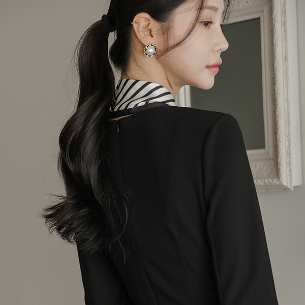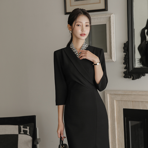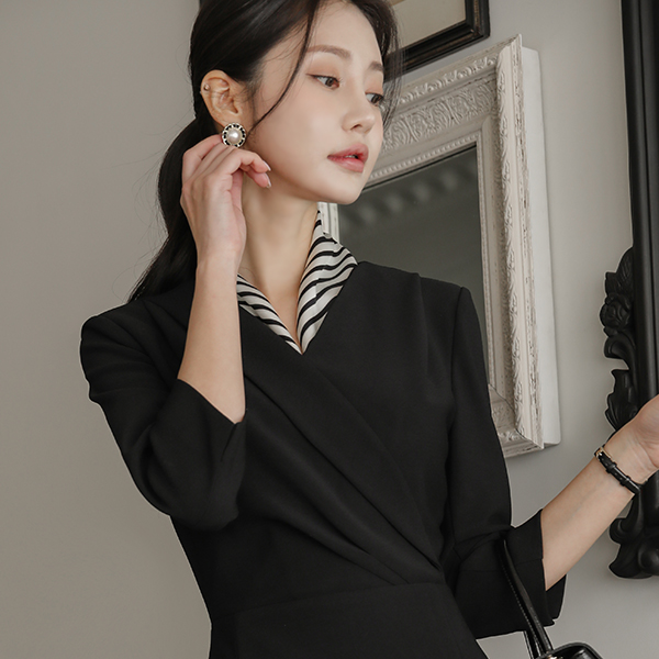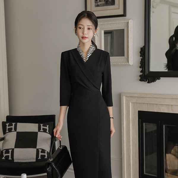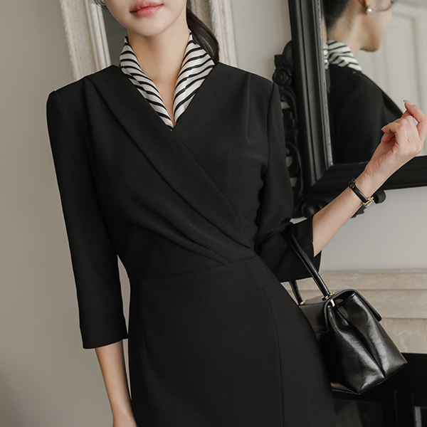 폴딩넥 ラップ サイド シャーリング 7分袖 スリット 弾力 ワンピース