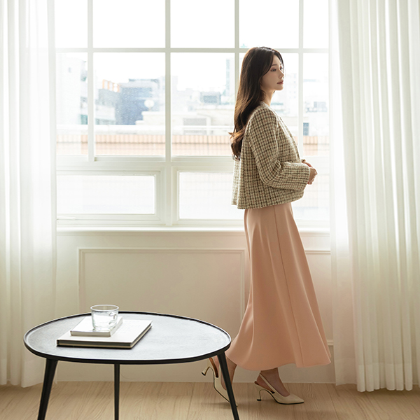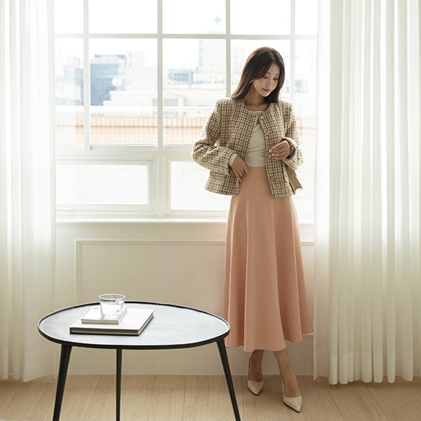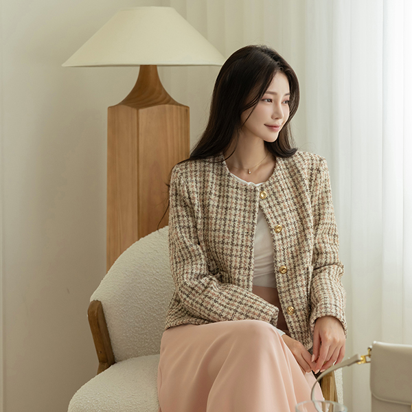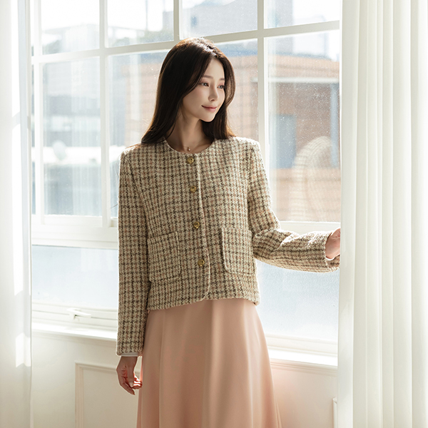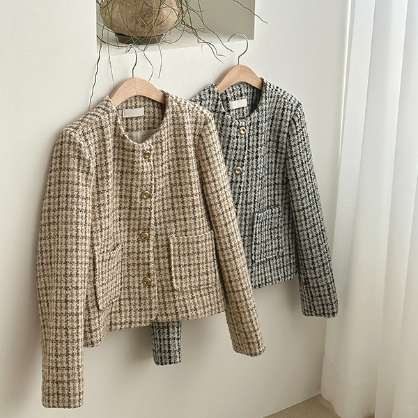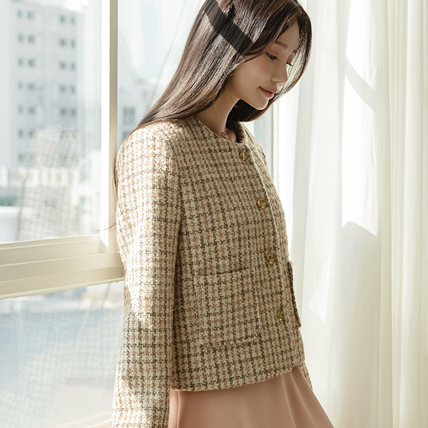 ローズ チェック ラウンドネック ウール ツイード ジャケット