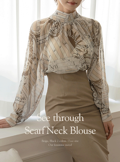 シースルー 捺染 スカーフネック ブラウス