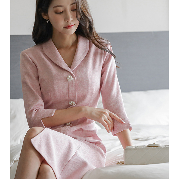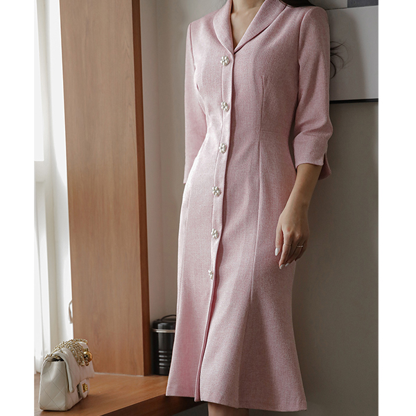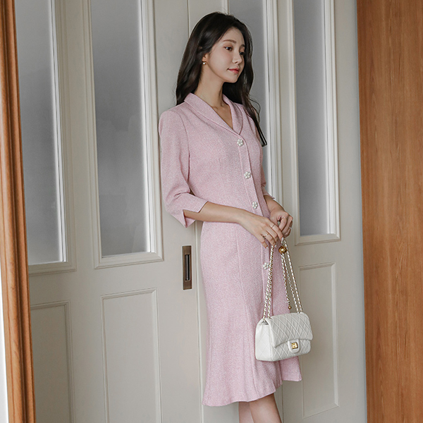 ツイード ショールカラー 花柄 真珠 ボタン マーメイド ワンピース