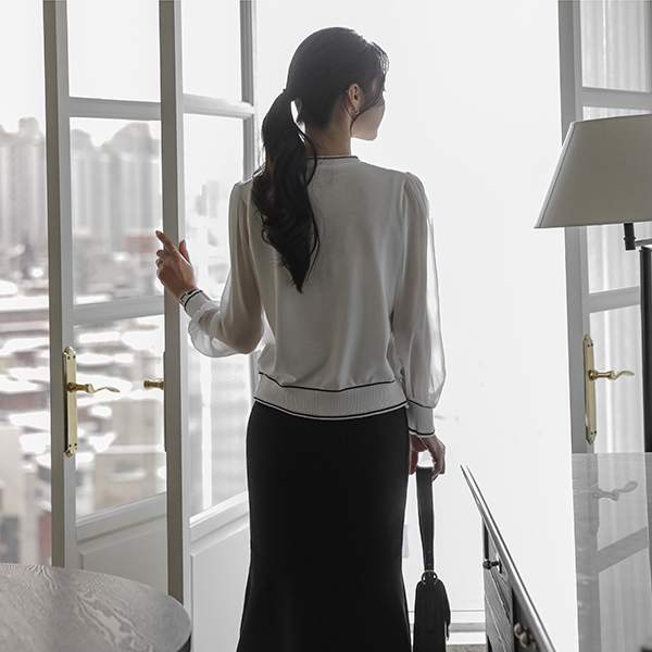 配色 裏地 シフォン 袖 レイス ニット