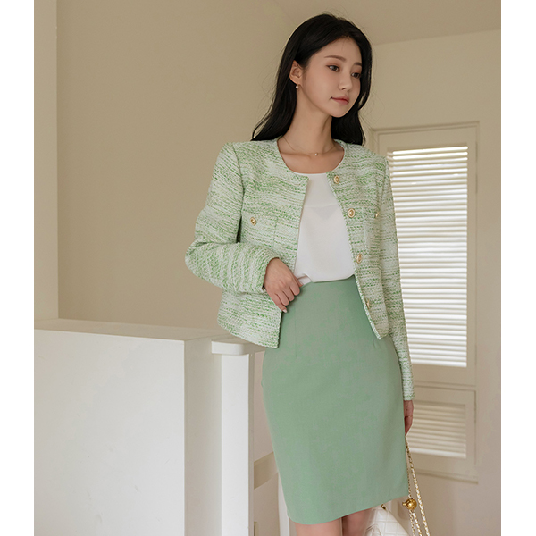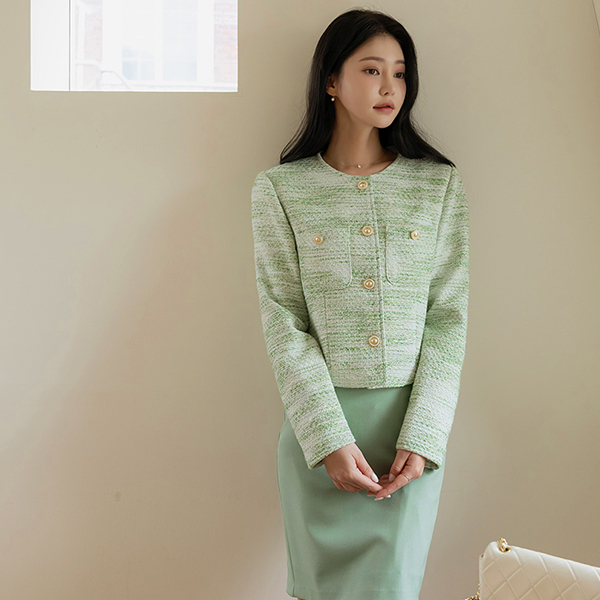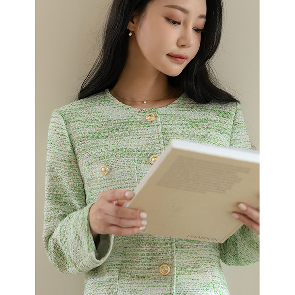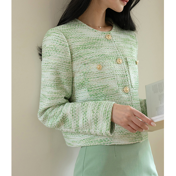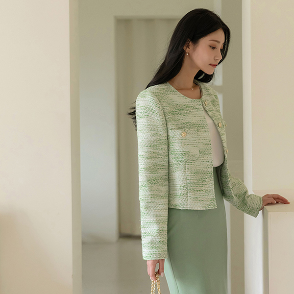 フレッシュ カラー ラウンドネック ツイード ジャケット