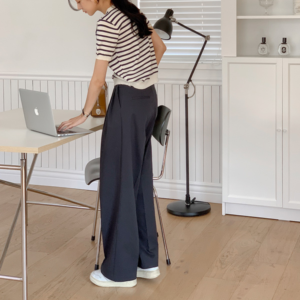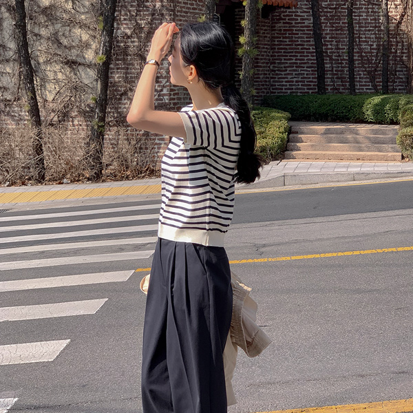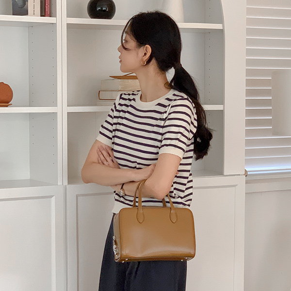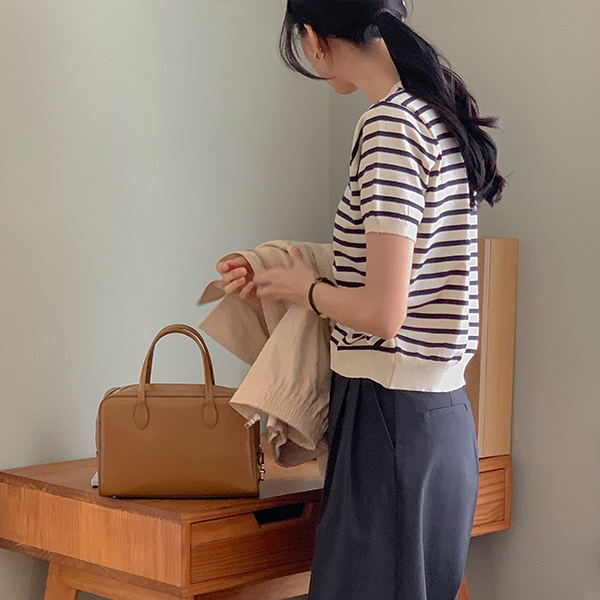 ベーシック ラウンドネック ストライプ 半そで ニット