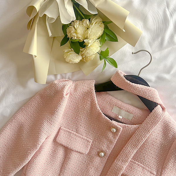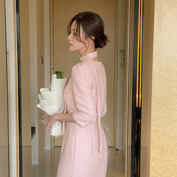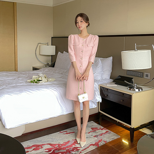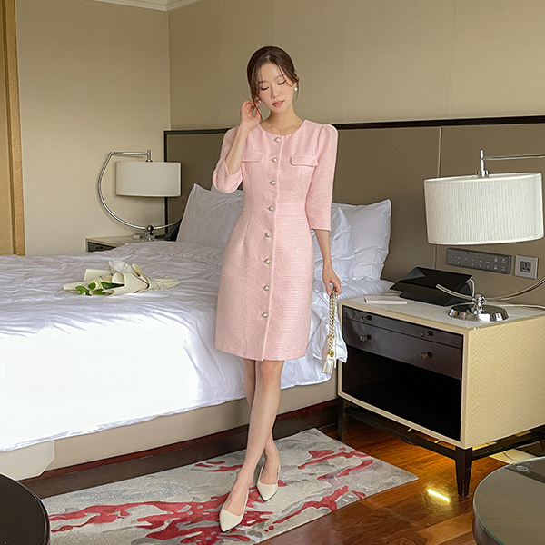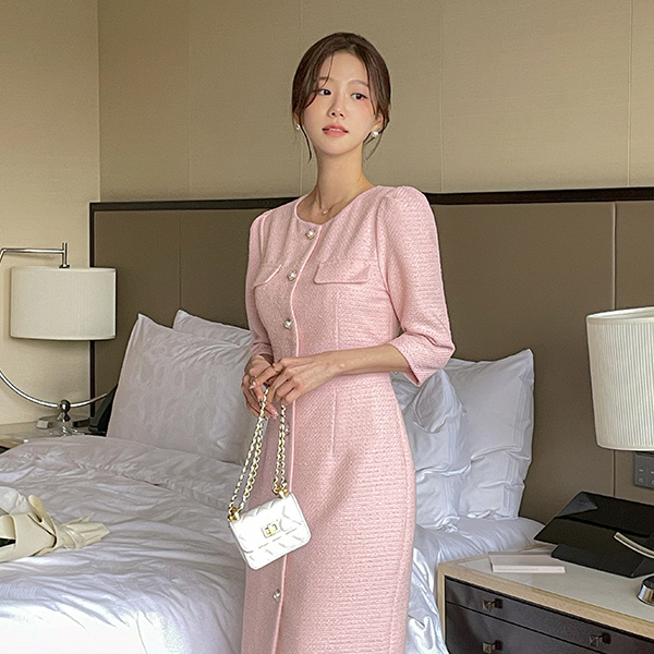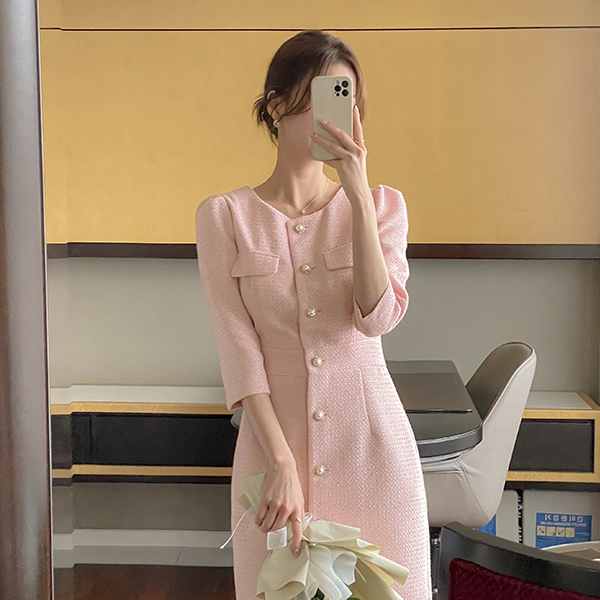 ロマンチック 真珠 ボタン スリムフィット ツイード ワンピース