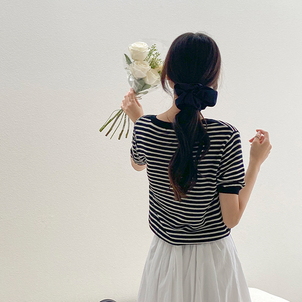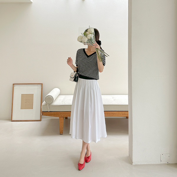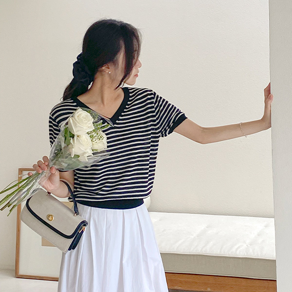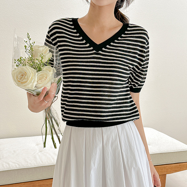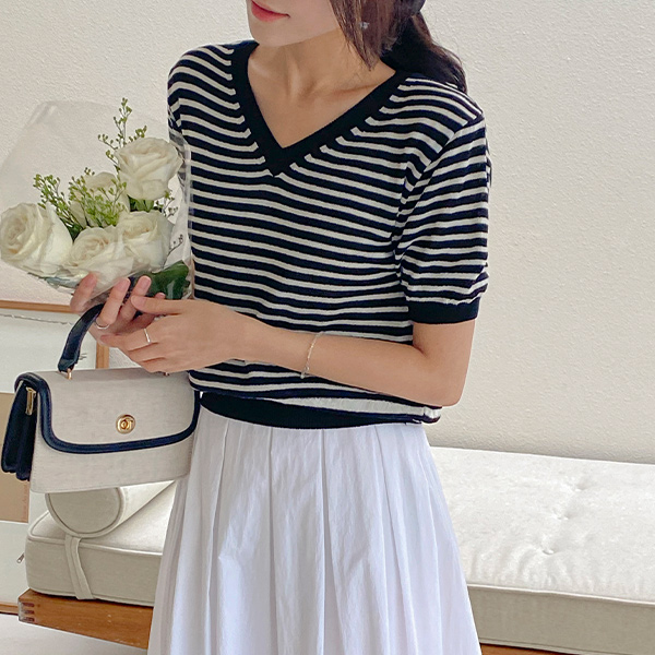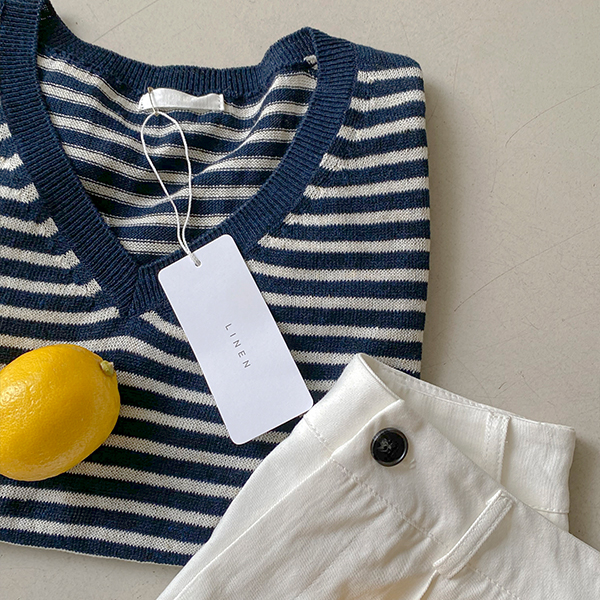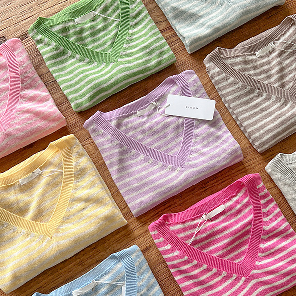 Vネック ストライプ リネン 半そで ニット