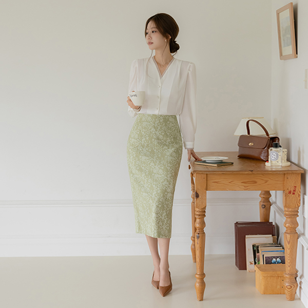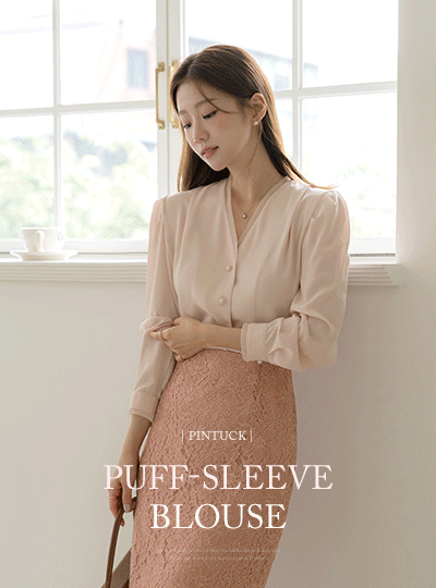 オーガンザ 配色 裏地 ピンタック パフ袖 長袖 ブラウス