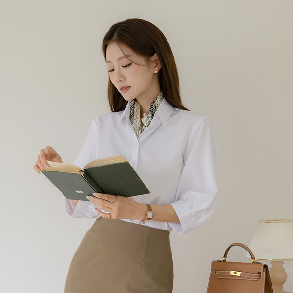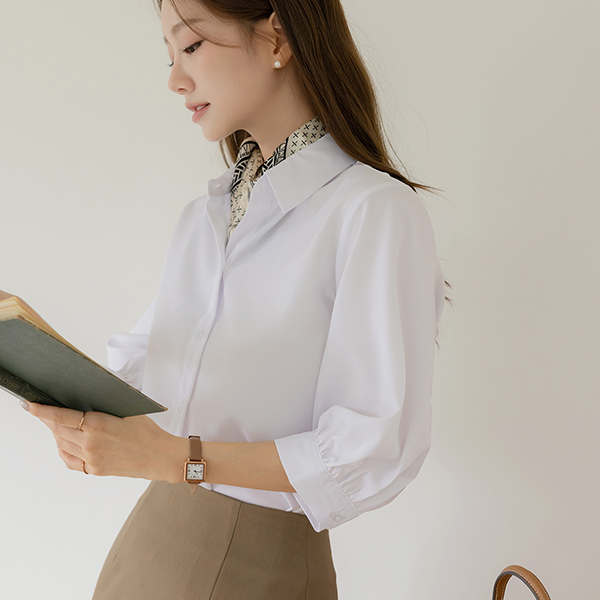 (1+1할인) シャーリング 7分袖 ソフト 弾力 ブラウス