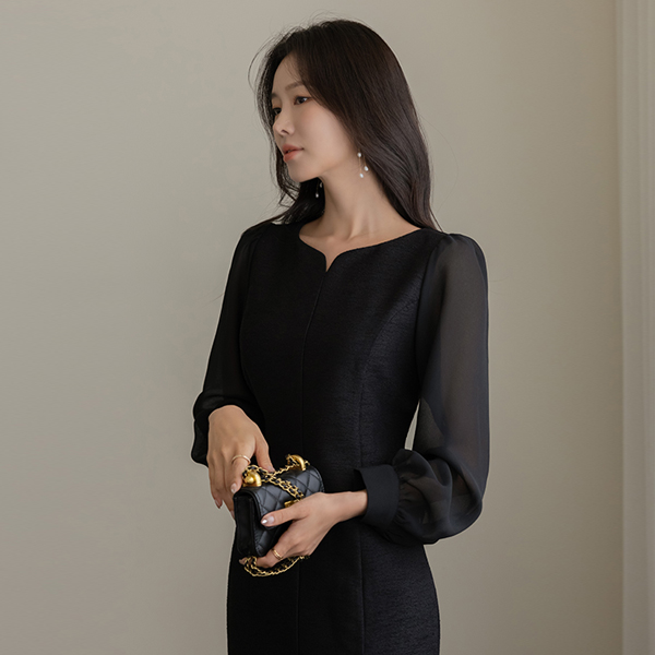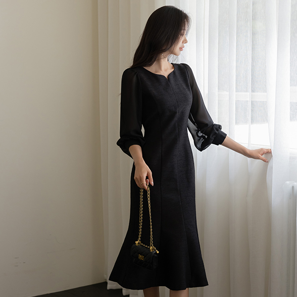 シフォン 袖 ハートネック マーメイド ツイード ワンピース