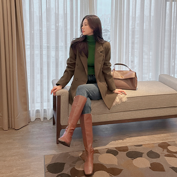 トレンディー スクエアトー レザー ロングブーツ