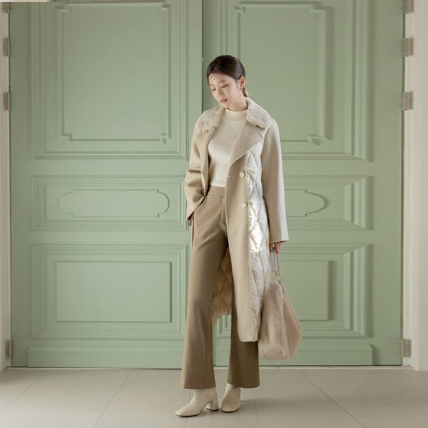 ミンクファー カラー グース 配色 バディング ウール ベルティード ロング コート