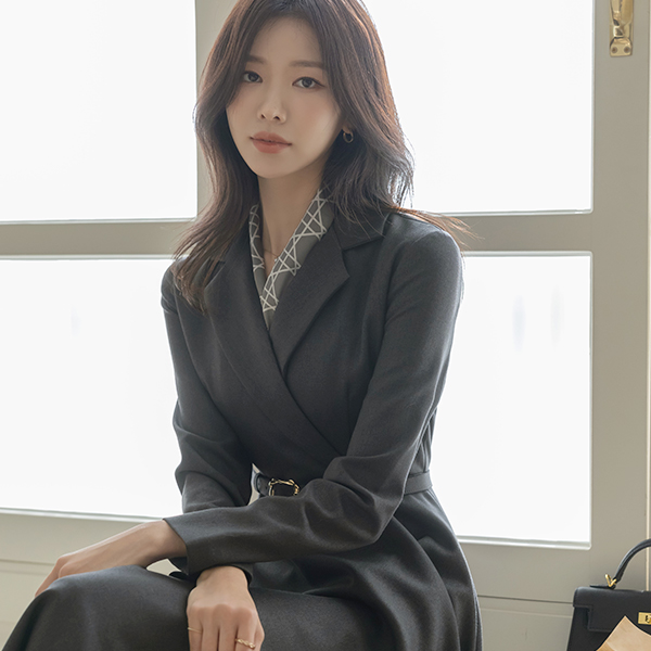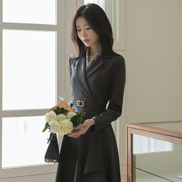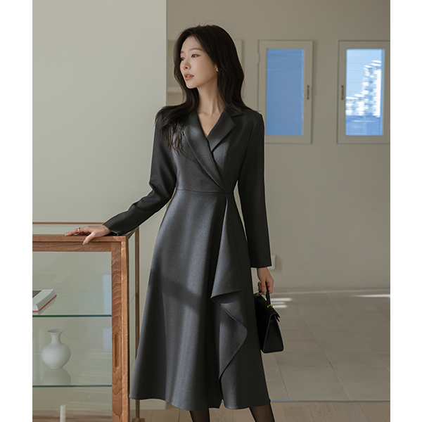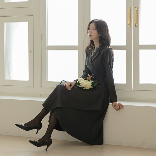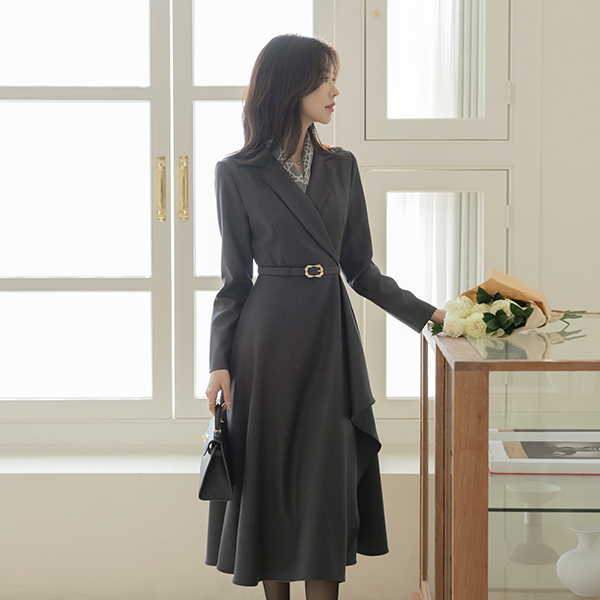 エレガンス ラッフル Aライン カラーネック ベルト ワンピース
