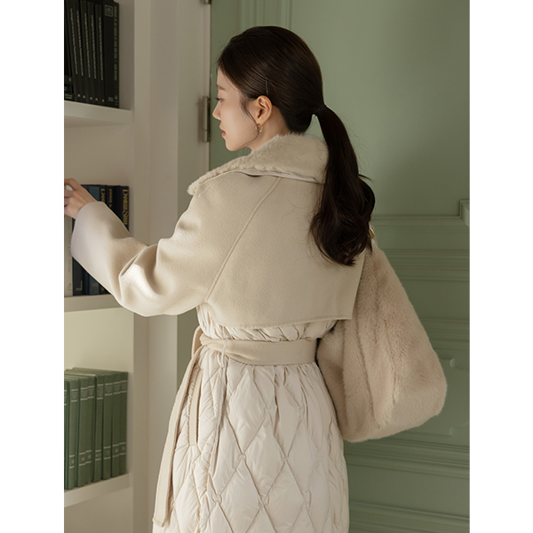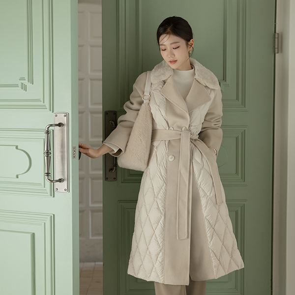 ミンクファー カラー グース 配色 バディング ウール ベルティード ロング コート