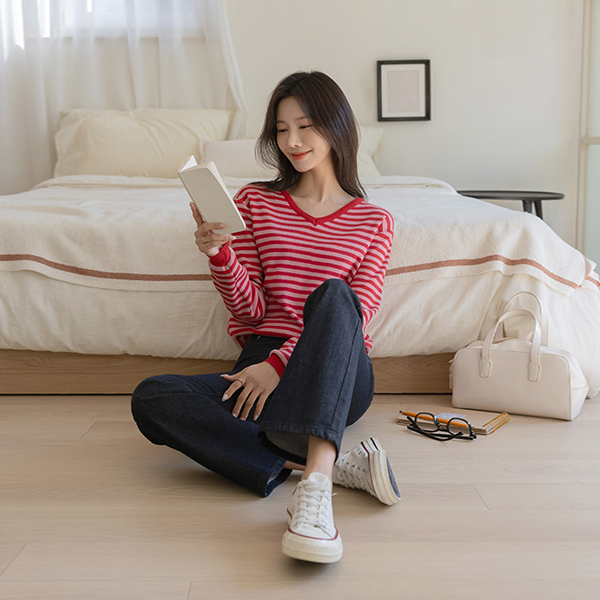 밍키 ソフト ストライプ ブイネック ニット