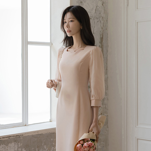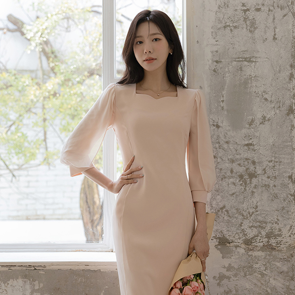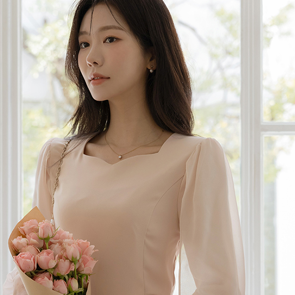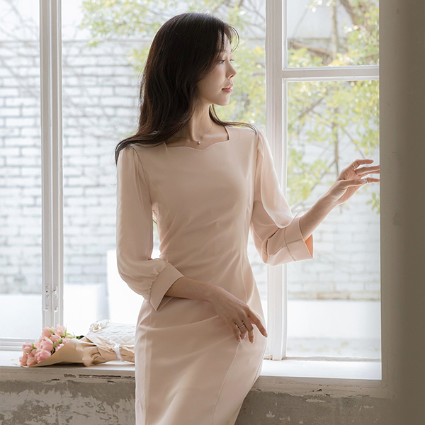 ロマンチック 二重 シフォン 袖 スリムフィット ワンピース
