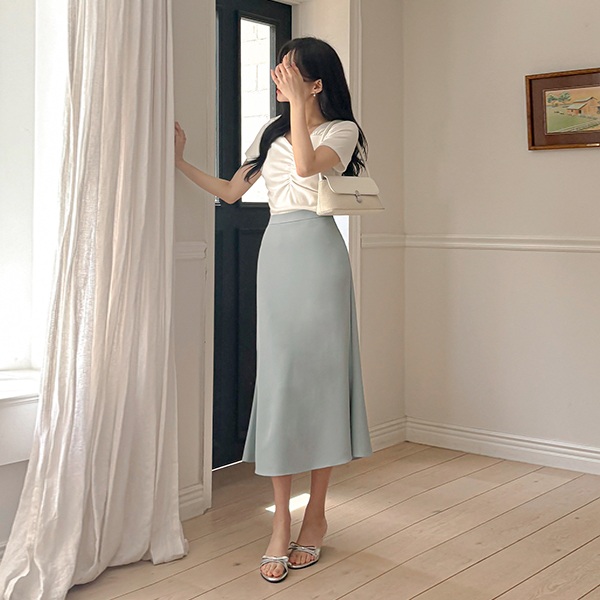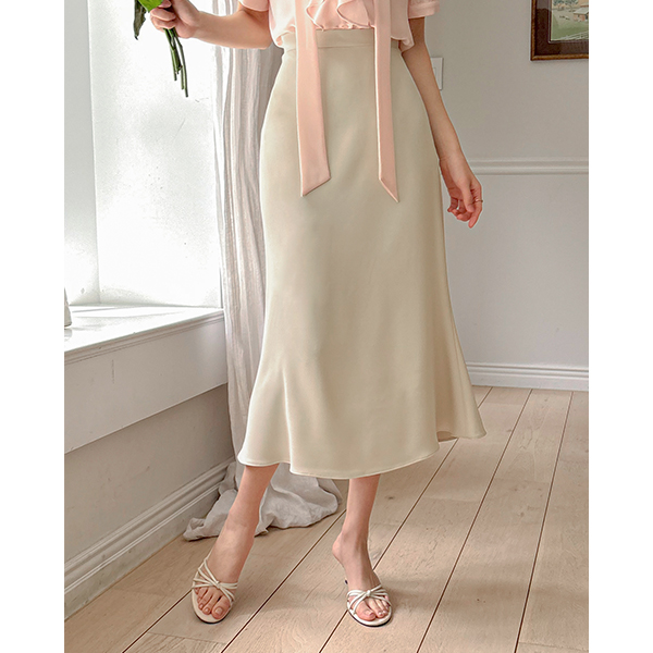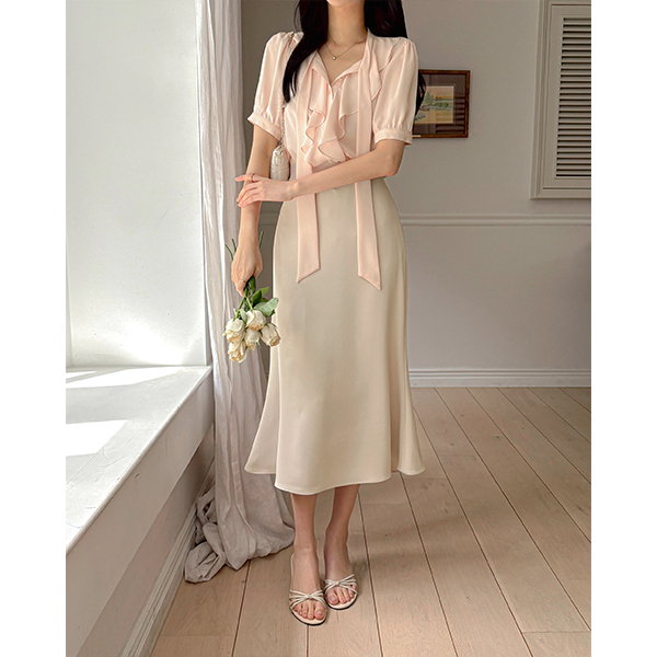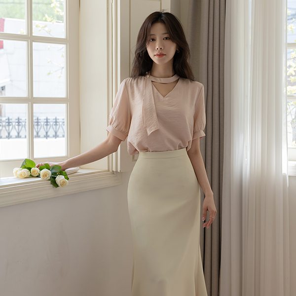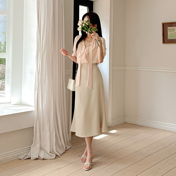 ソフト ラッフル カラー タイネック パフ ブラウス