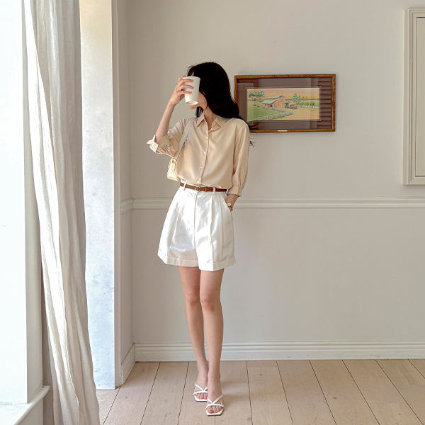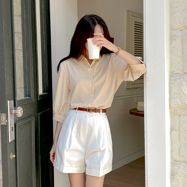 (1+1할인) シャーリング 7分袖 ソフト 弾力 ブラウス
