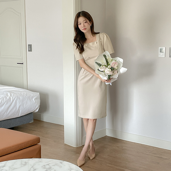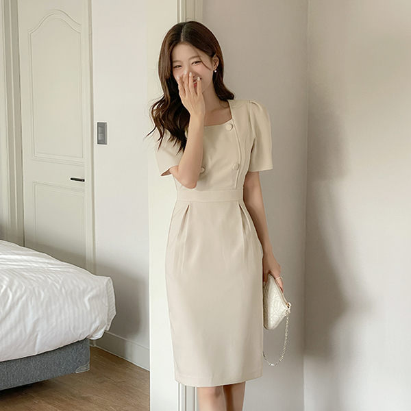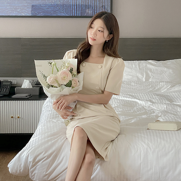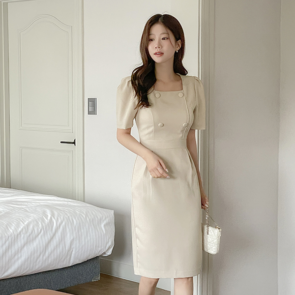 クラシック スクエアネック ダブルボタン Hライン ワンピース