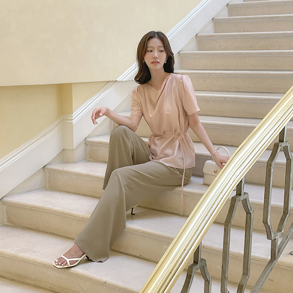 Loel グロッシー カウルネック 半そで ブラウス(+ベルト)