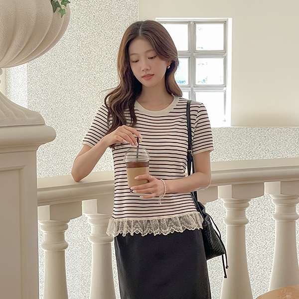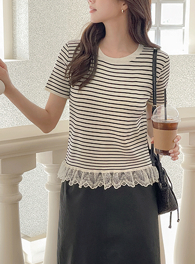 ストライプ レイス 裾上 半そで ティーシャツ