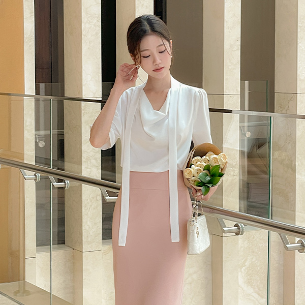 サテン グロッシー カウルネック タイ 半そで ブラウス