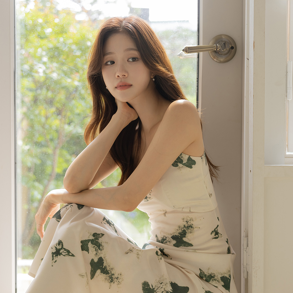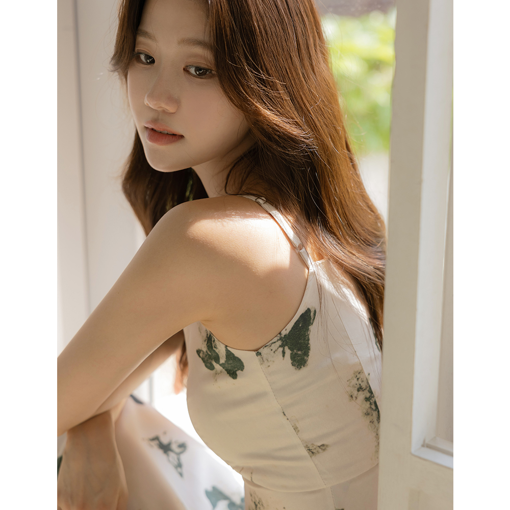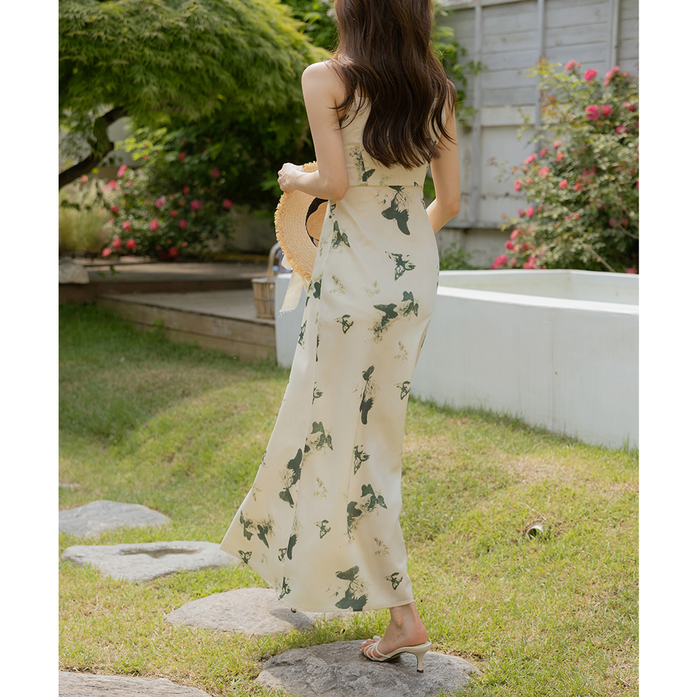 シルキー 捺染 ロング サテン 紐 ワンピース