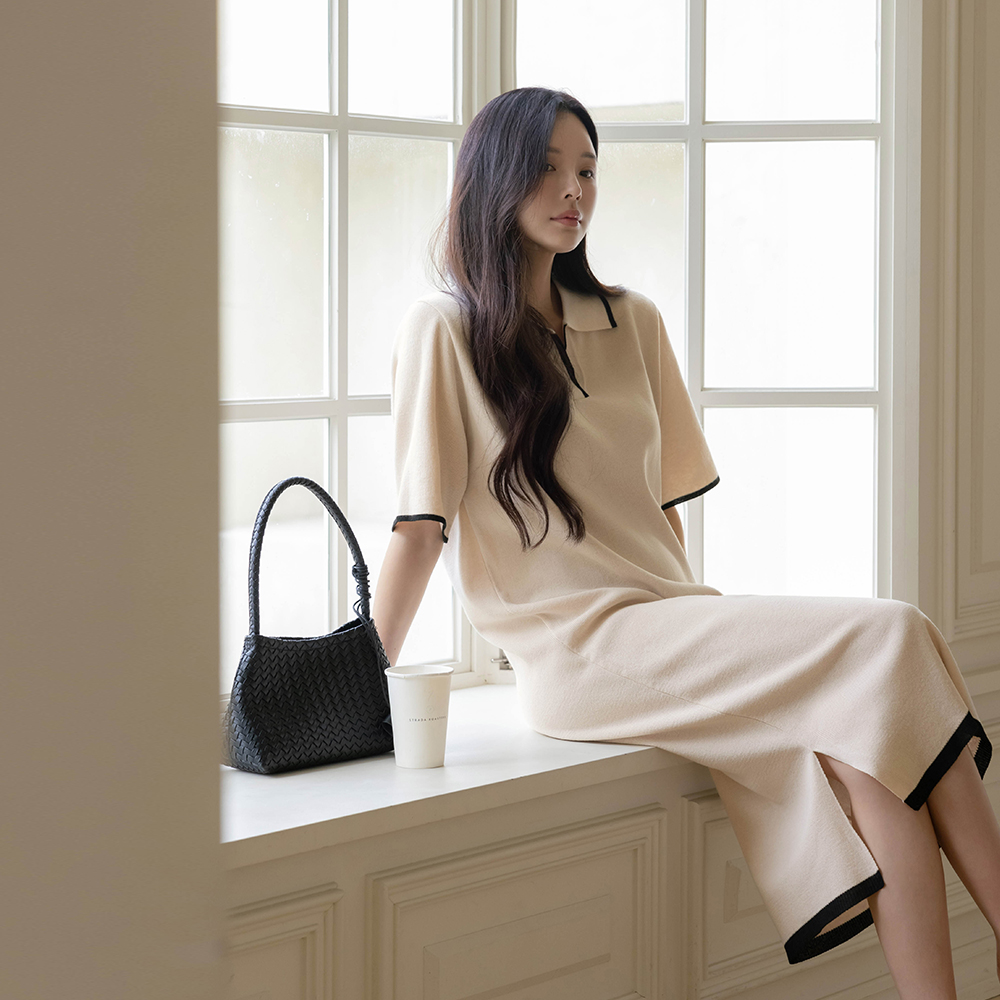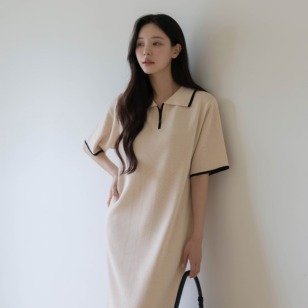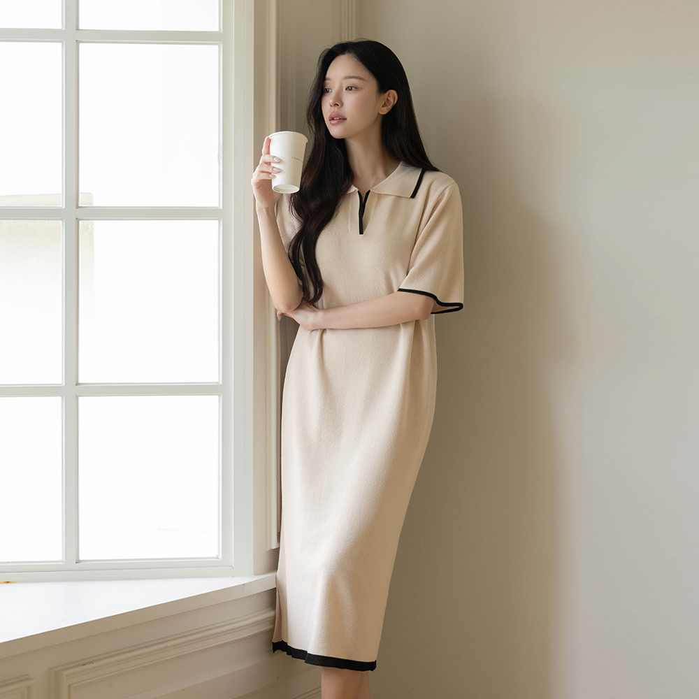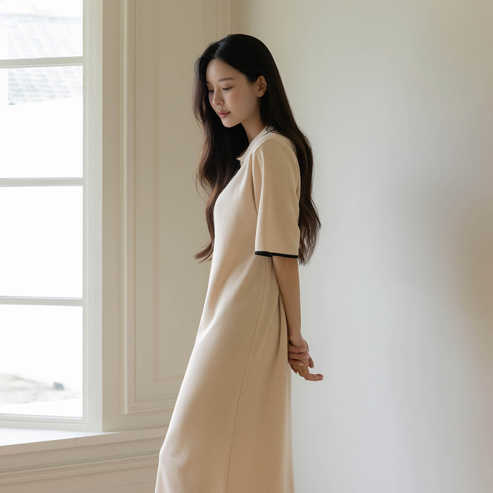 バンブー カラーネック 配色 ロング ニット ワンピース